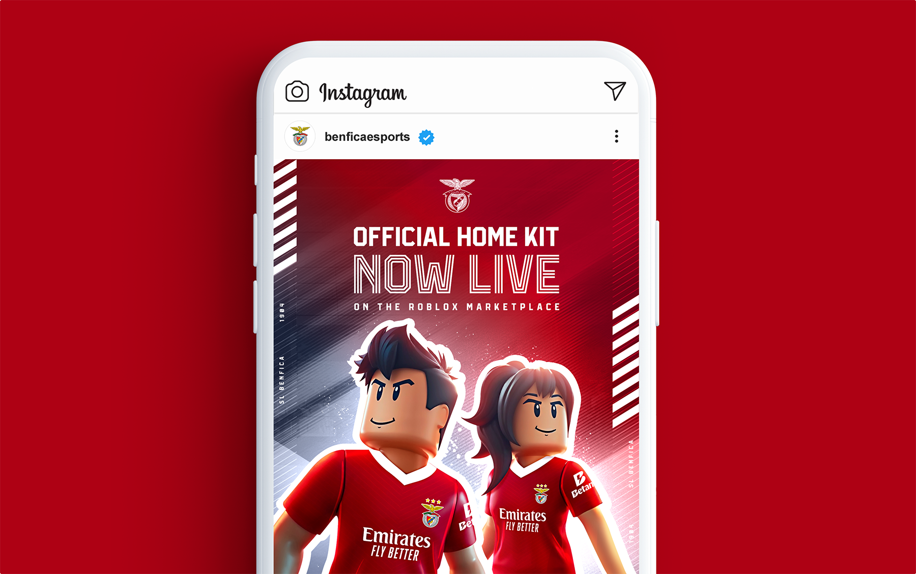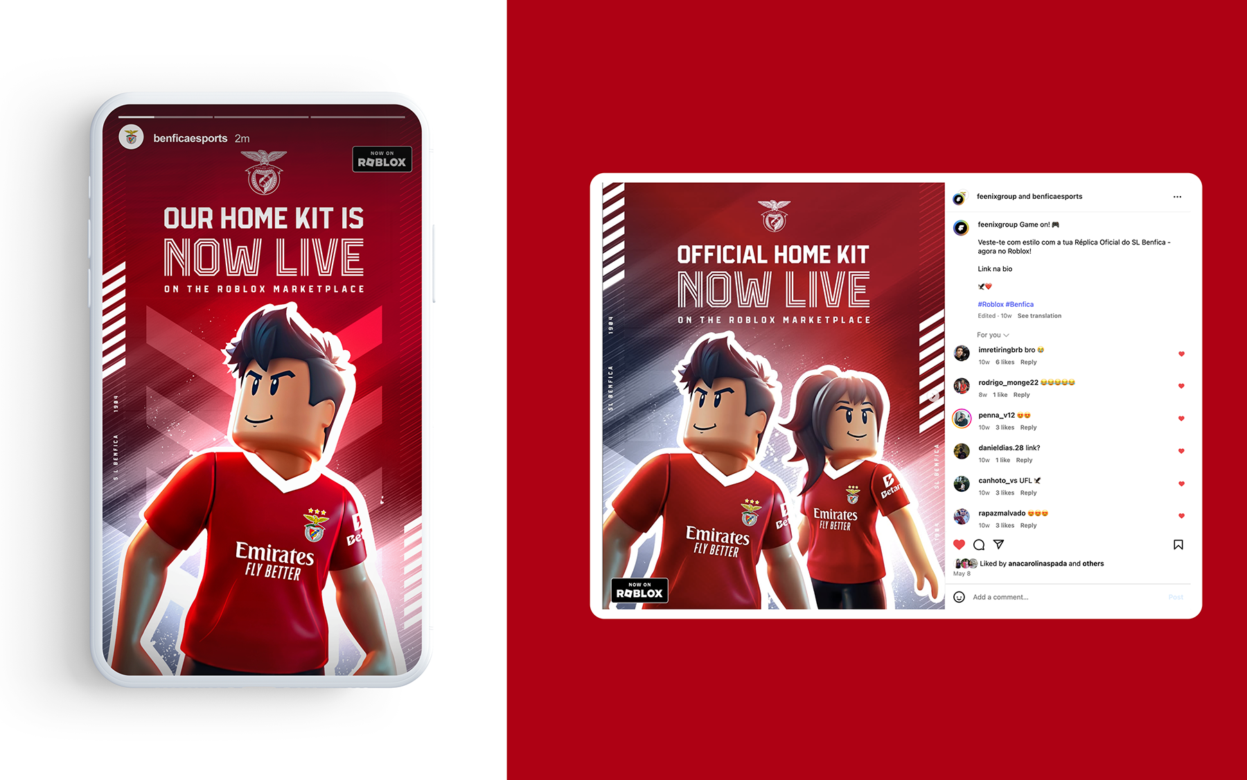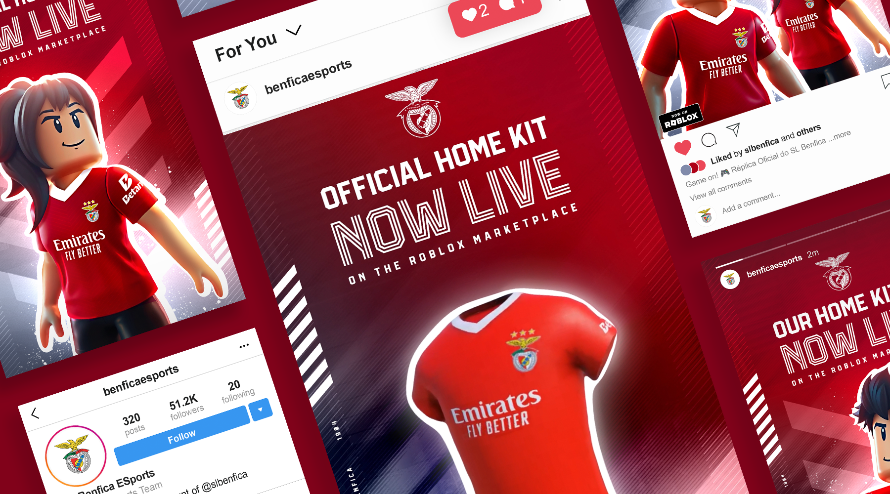 SL Benfica led the way as the first Portuguese football club to launch its 2024/25 official home-kit jersey on Roblox. I created the social visuals to align seamlessly with Benfica’s iconic brand colors, typefaces, and tone, ensuring a cohesive look across every channel. The campaign’s success was instant, with more than a thousand virtual items claimed within the first hour.